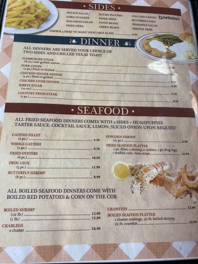 Whole catfish, two pieces, served with a choice from 17 side options including salads, fries, beans, greens, and corn.
